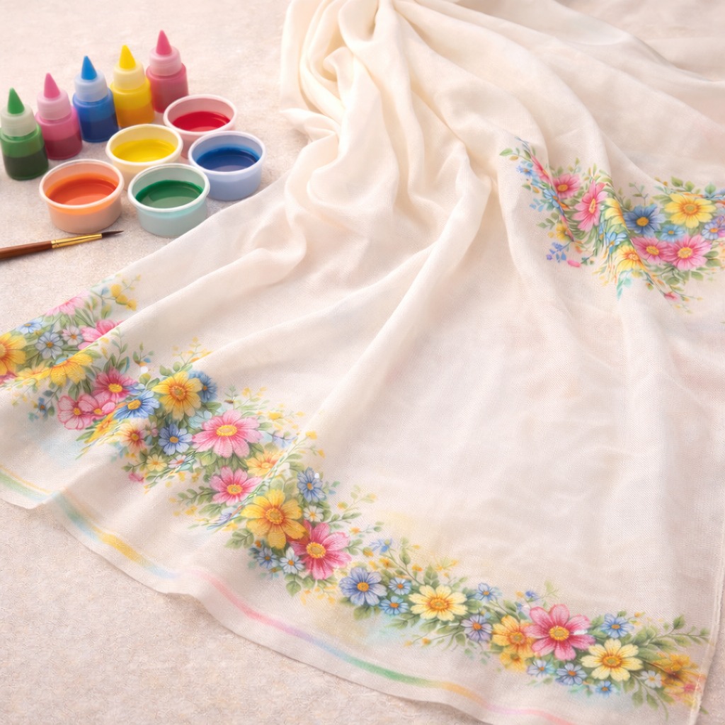 Luxury silk painting using Serti technique with precision and color flow control.